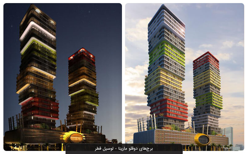 برجهای دوقلو مارینا، واقع در شهر نوساز لوسیل قطر، به عنوان نمادی از معماری مدرن و خلاقانه، چشم هر بینندهای را خیره میکنند. این سازههای بلندمرتبه، با طراحی رنگارنگ و منحصربهفرد خود، گویی بلوکهایی مجزا از دل سازه بیرون زدهاند، و با ارتفاع و ساختار خاص خود، جلوهای ویژه به خط افق لوسیل بخشیدهاند.