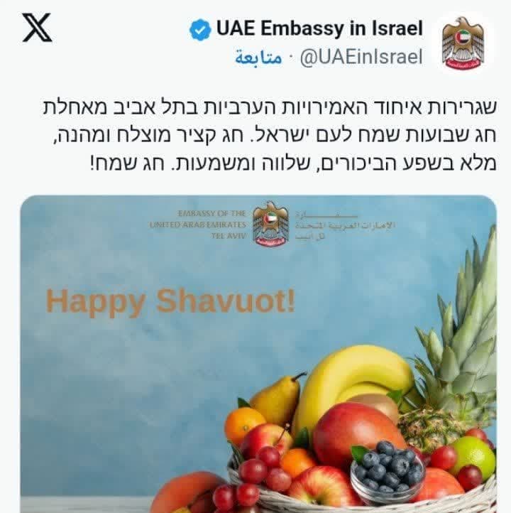 روز گذشته، این سفارت با انتشار پیامی به زبان عبری در صفحه رسمی خود در سکوی ایکس، «عید شفوعوت» یهودی را به صهیونیست‌ها تبریک گفت. این تبریک با وجود جنایات مداوم صهیونیست‌ها در کرانه باختری و همچنین نسل‌کشی‌ها در نوار غزه صورت گرفت.